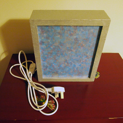 The old wood frame gained a new life as a modern lamp. The glass is painted in an abstract way in blue, silver and purple. When switched on it gains an extra dimension.